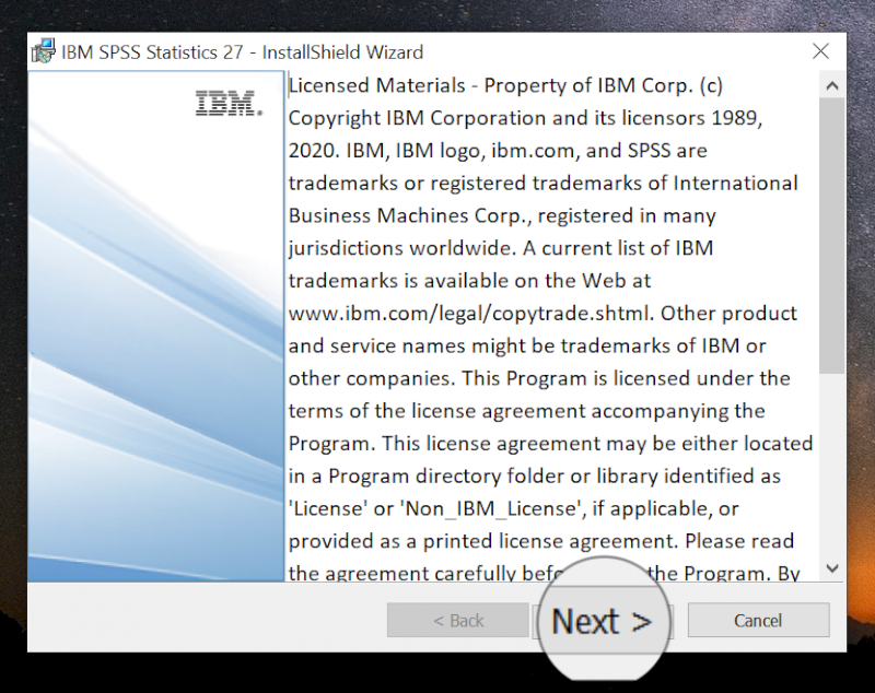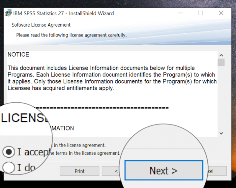 Daha sonra ise SPSS’in lisanslı bir ürün olduğunu ve lisans şartnamesini okumamızı söyleyen bir ekran çıkacaktır. Burada da “I accept the terms in the license agreement” seçeneğini tıklayarak lisans koşullarını kabul ettiğimizi ve belirtilen şartları kabul ettiğimizi beyan ediyoruz.