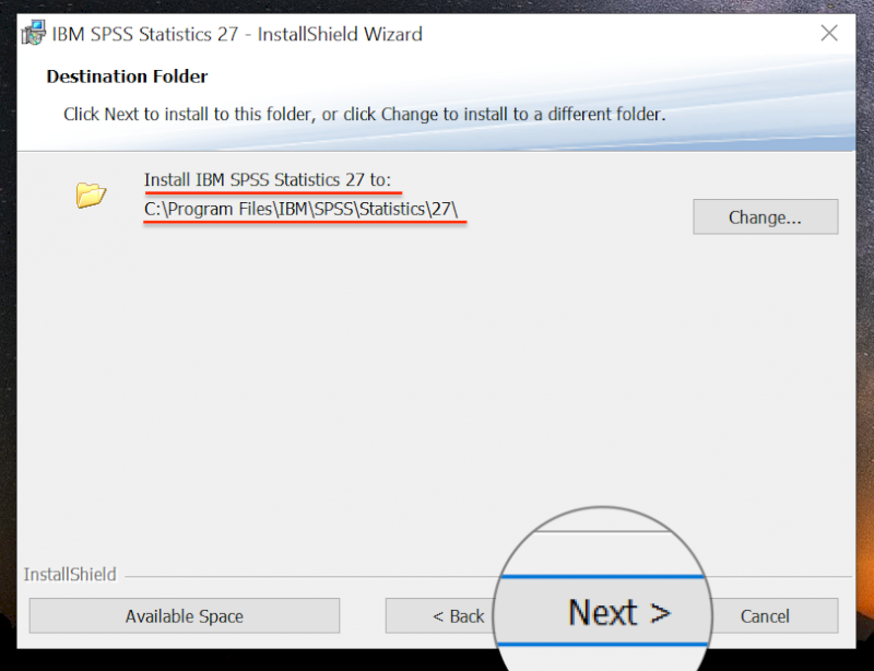 Bu ekranda bir diğer önemli nokta ise SPSS’in hangi sürücüye ve klasöre kaydedildiği gösterilir. Resimde C sürücüsünde IBM klasörünün oluşturulduğu ve bu klasöre SPSS’in kopyalandığını ve kurulacağını görebilmekteyiz.