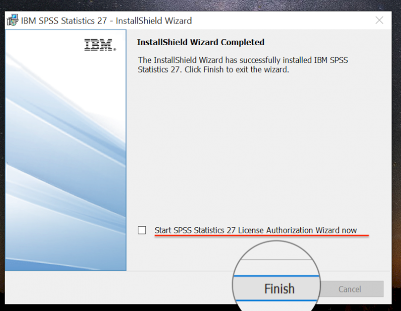 Bu ekranda önemli olan bir diğer nokra kırmızı ile işaretlenen “Start SPSS Statistics 27 License Authorization Wizard now” kısımdır. Burada yer alan kutucuğu işaretlediğimizde “Finish” seçeneğini tıkladığımızda lisans yetkilendirme sayfası açılacak ve burada SPSS programının sınırsız kullanımı için lisansımızı aktif etmemiz istenecektir.