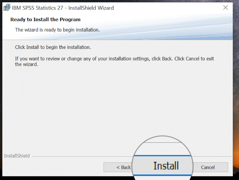 Bir sonraki ekranda ise SPSS kurulmadan önce herhangi bir değişiklik yapmak isteyip istemediğimiz sorulur ya da kurulumu iptal edebileceğimiz bilgileri verilir. Bu ekran da “Install” seçeneğini tıkladığımızda SPSS programı bilgisayarımıza kurulmaya başlar.