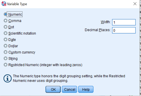 Type: Değişken türünün (tipinin) tanımlandığı hücredir. Aksi belirtilmediği sürece spss programı bütün verileri sayı olarak tanımlamaktadır